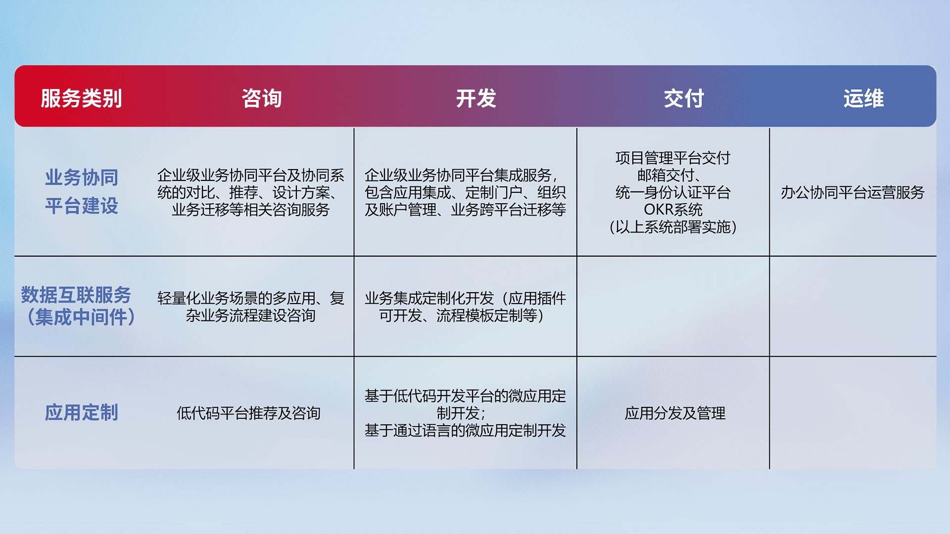 针对钉钉、、企微、、、、IDaas等平台级产品提供产品的规划、、、方案、、、、交付、、定制化开发等服务,,,实现如统一协同办公、、、、智能客户服务、、混合会议管理、、、智能数据查询、、、等业务场景,,实现数字化转型。。